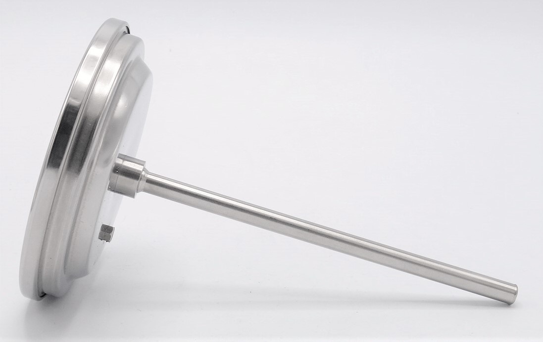 All-stainless steel bimetal thermometer with immersion shaft in well