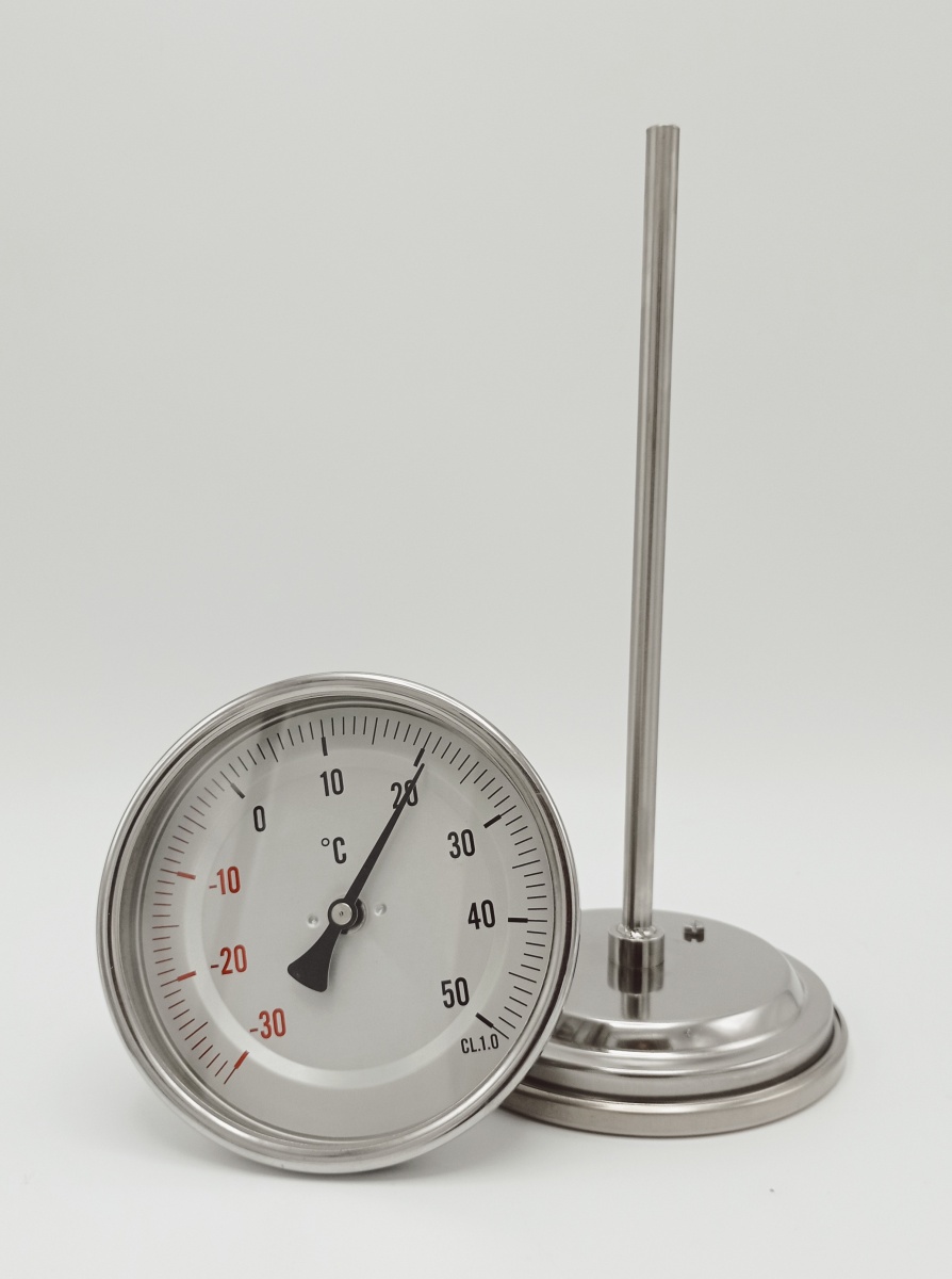 All-stainless steel bimetal thermometer with immersion shaft in well 200 mm