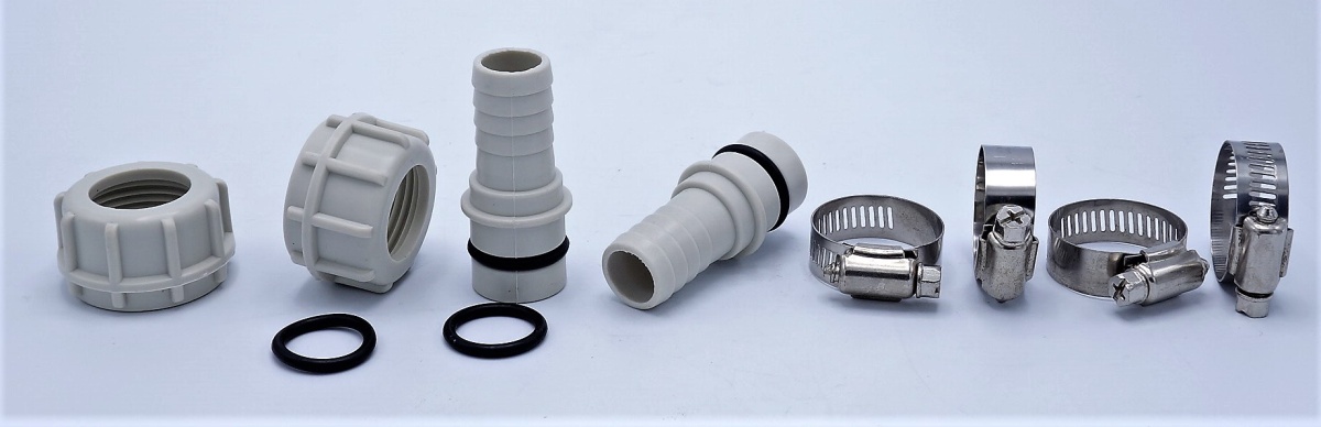 - Included are 2pcs union nut, 2pcs hose adapter (plastic version) and 4pcs hose clamp 29-32 mm
