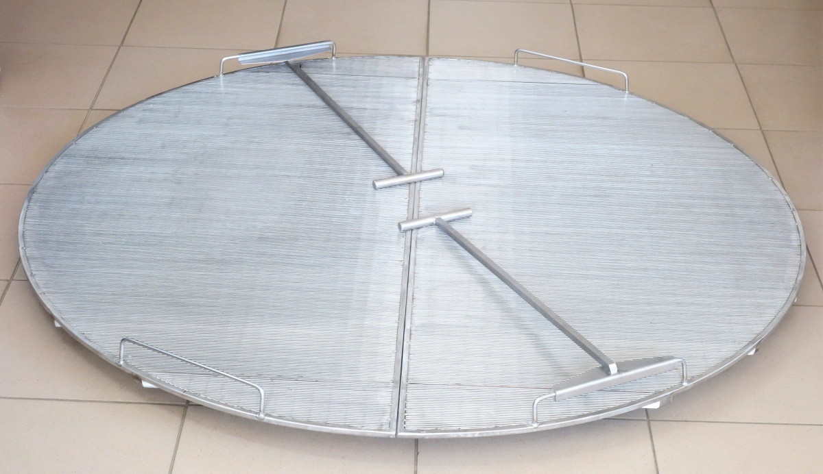 The false bottom in a lauter tun has thin slits to hold back the solids and allow liquids to pass through. The solids, not the false bottom, form a filtration medium and hold back small solids, allowing the otherwise cloudy mash to run out of the lauter tun as a clear liquid. - Source of information -Wikipedia-