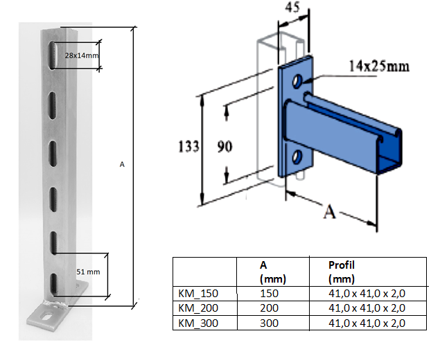 Robust design. U-profile rail 41 x 41 mm, welded on an anchor plate for direct wall mounting.