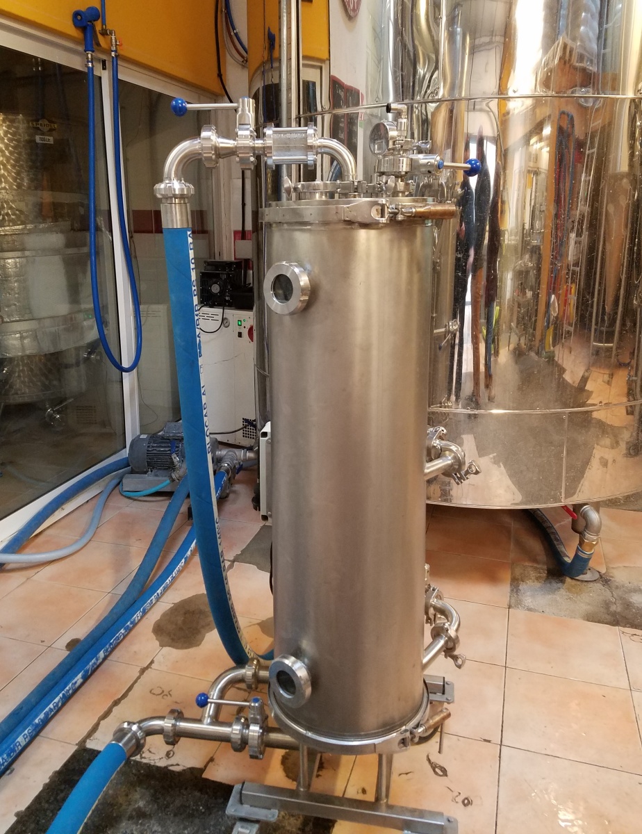 Answer: The entire HM device is designed to be completely disassembled, i.e. it can be completely disassembled and cleaned if necessary. After the end of the cold hopping process and depressurization of the container, residual beer that could no longer be squeezed back into the tank is released into the channel, then it is pulled out by internal filters (which can be washed with pressurized water) and then the entire HM body. After a thorough pre-washing, the entire HM is then assembled and connected to an external CIP unit and standard sanitation is carried out with 2% lye 65-70°C and weak peracetic acid max. 1%.