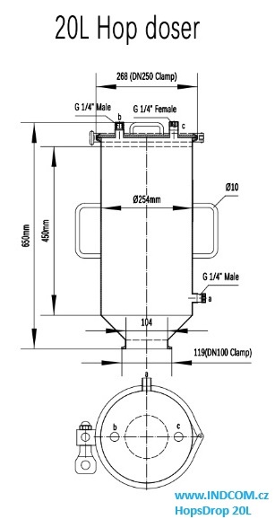 The HopsDrop generally consists of a DN 100 butterfly valve that is fixed on the fermenter (can be adjusted according to your connection on the fermenter). Additionally, the HopsDrop has a 1/4" BSP CO2 valve at the bottom that pushes oxygen into the 1/4" BSP valve at the top of the lid. A 0-4Bar manometer is also installed on the cover.