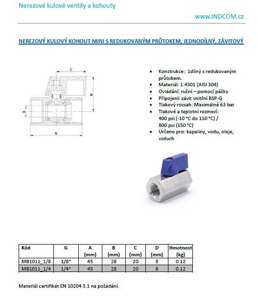 MINI stainless steel ball valve with reduced flow, one-piece, threaded