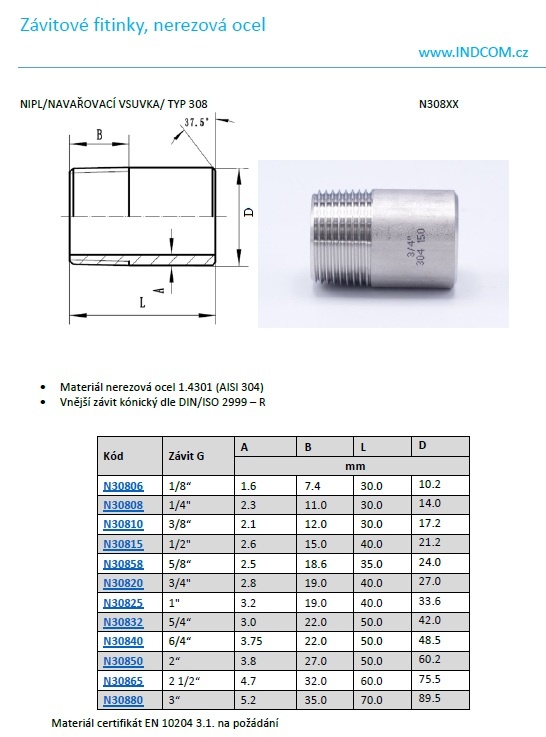 Welding nipple materialstainless steel 1.4301 (AISI 304)