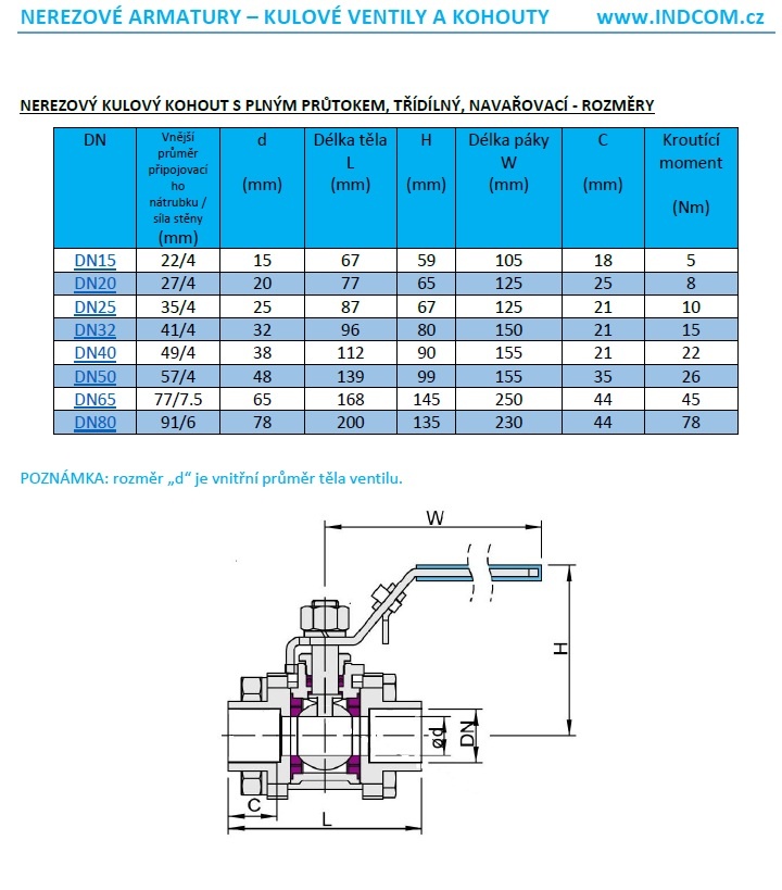 - Material: body and ball 1.4301 (AISI 304), seat PTFE, gasket PTFE