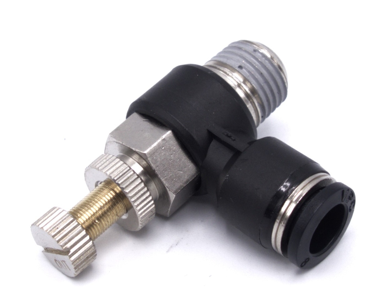 One-way throttle valve, L-shaped, outlet throttle for hand adjustment