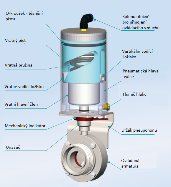 A pneumatic single-acting actuator (air/spring) is used for opening and closing direct valves with compressed air (recommended value for safe opening of the damper is 5 - 7 bar). The pneumatic actuator's spring serves to close direct damper (without control air pressure) or indecreaseontrol air pressure for a safe closing of the valve (damper).