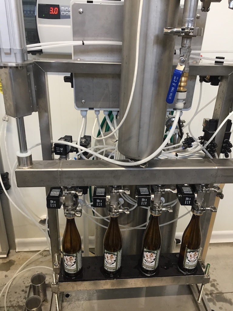 - the bottling line has 4 rinsing nozzles, 4 filling heads with filling needles and 1 crown capping head