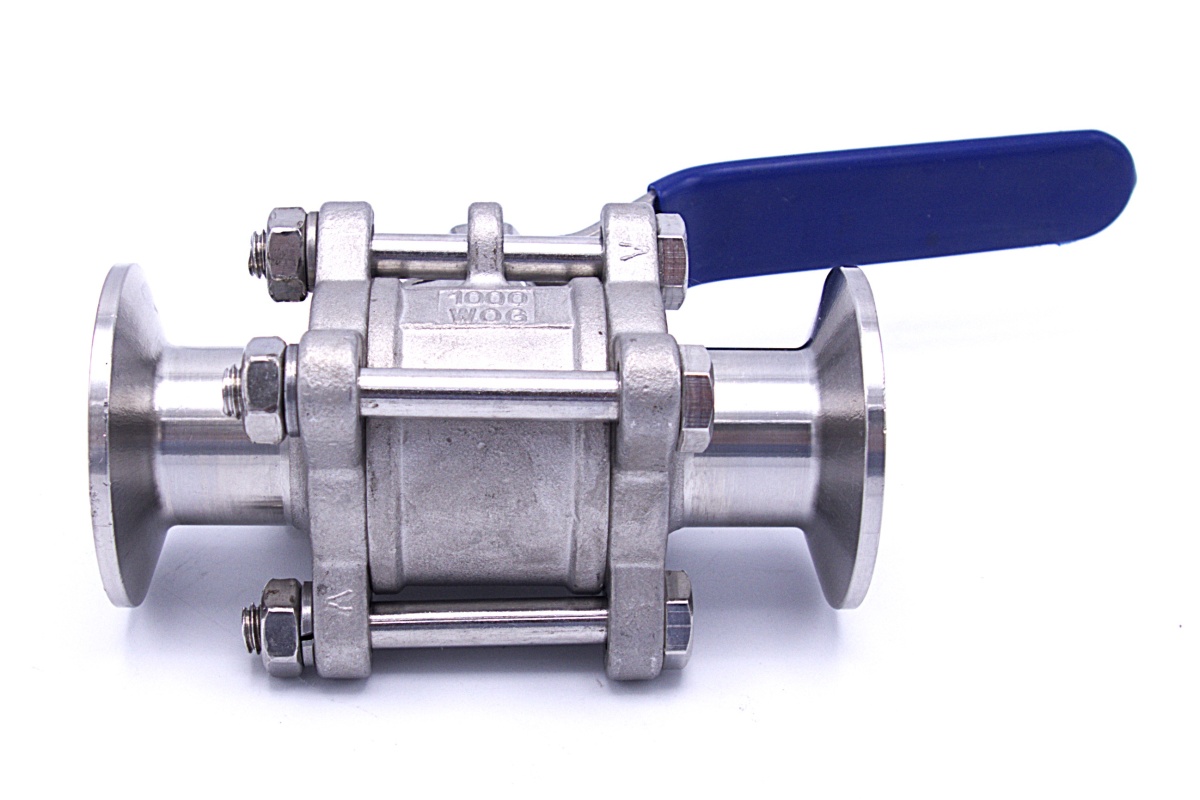 Stainless steel ball valve with full bore, three- pieced, CLAMP