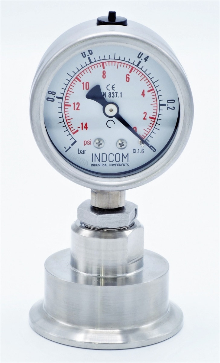 Stainless steel manometer, dial 63 mm, with separating membrane-CLAMP DIN 32676, collar 64 mm | -1 to 0 bar, (CLAMP-64 mm)