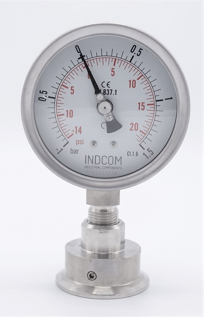- Manometr číselník 100mm, rozsah -1 do 1.5 bar, CLAMP DIN32676, oddělovací mebrána, technivký list