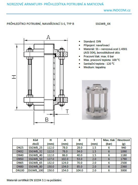 Straight sight glass, welded S-S, type B