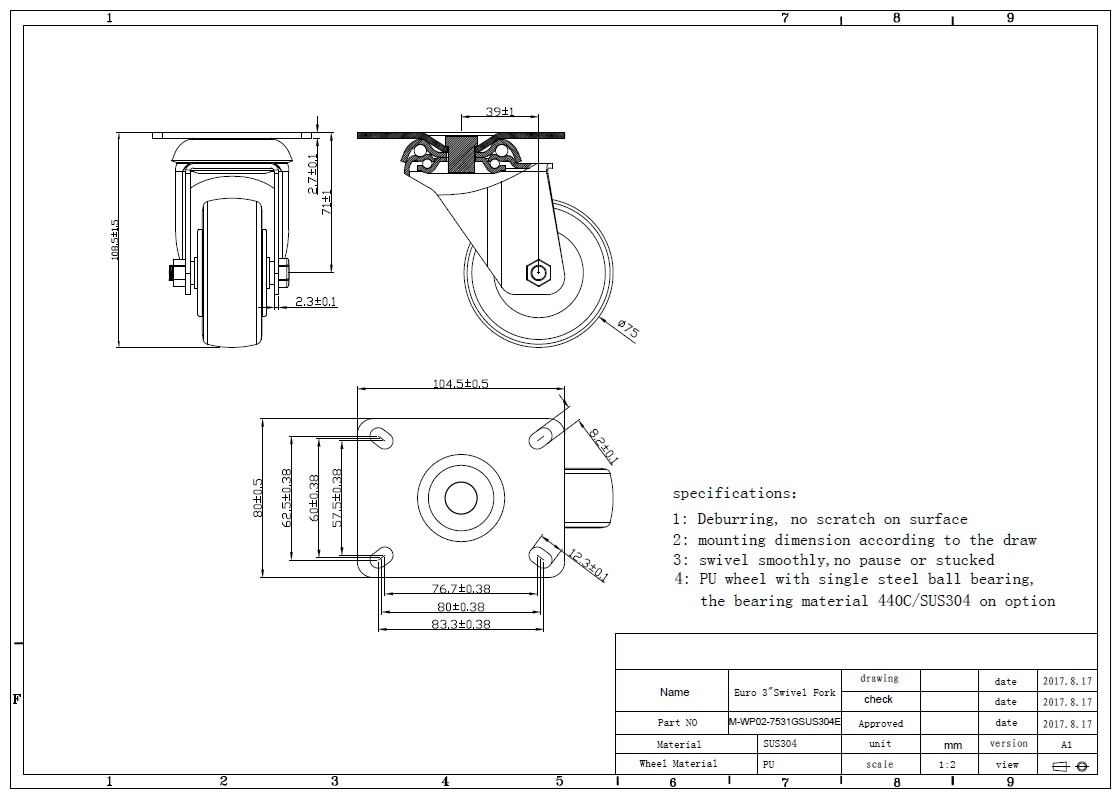Caster sizediameter 75 mm, thickness 31 mm